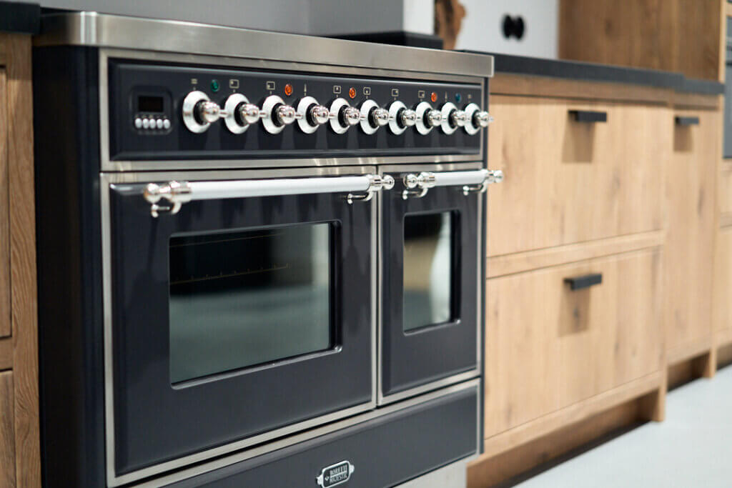 Een bourgondisch viergangen menu bereiden op uw brede losstaande gasfornuis, bijvoorbeeld een Italiaanse Barazza in klassieke stijl. Een warm welkom in uw landelijke keuken, waarin u uw afzuigkap wegwerkt in een grote, opvallende schouw.